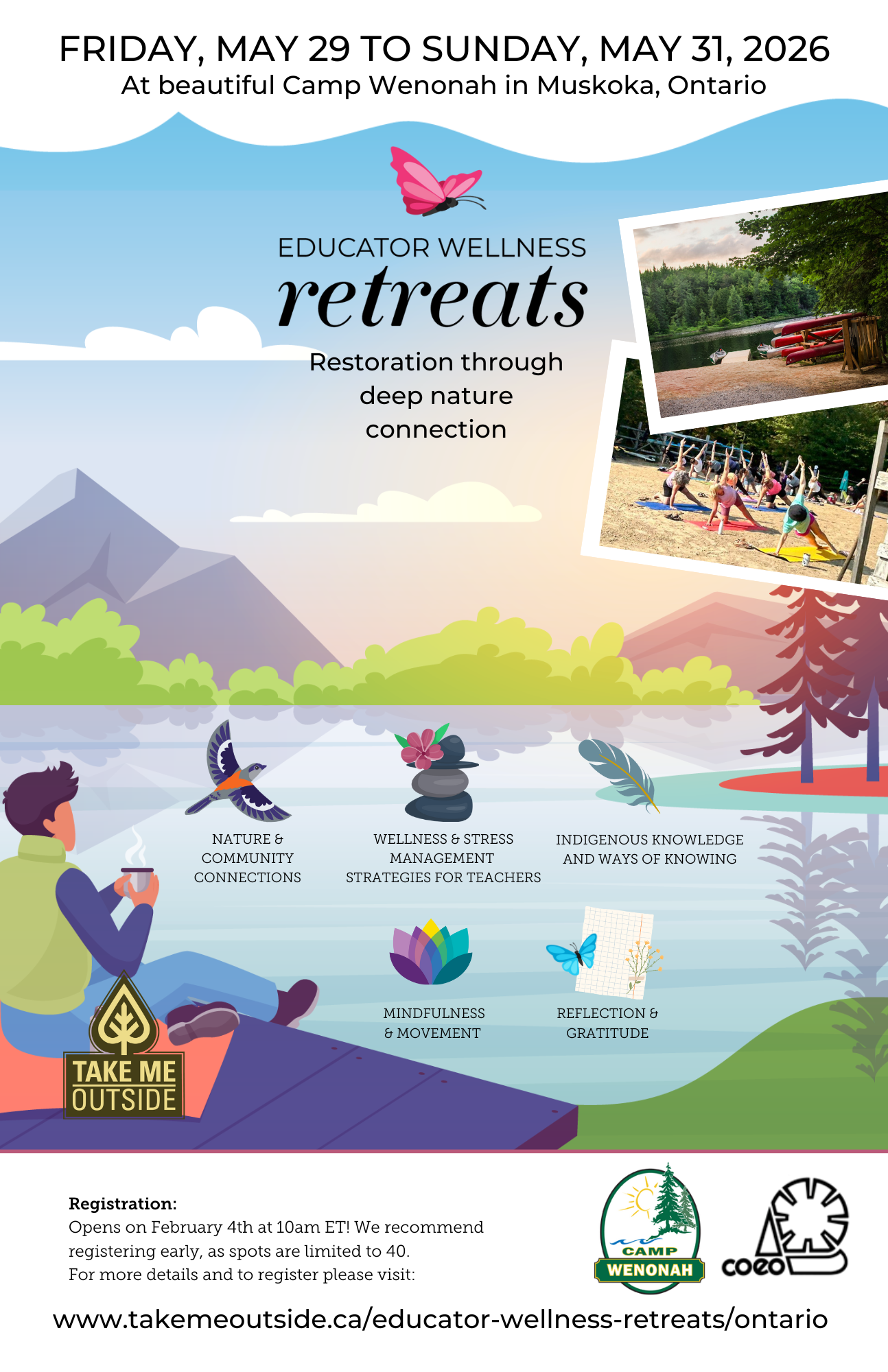 Cancellation Policy: Please notify us as soon as possible at info@takemeoutside.ca if you need to cancel your registration. Cancellations made at least 30 days before the date of the Retreat are fully refundable. In the case that Take Me Outside had to cancel an Educator Wellness Retreat, every effort would be made to notify participants at least 30 days before the event and all registration fees would be fully refunded.