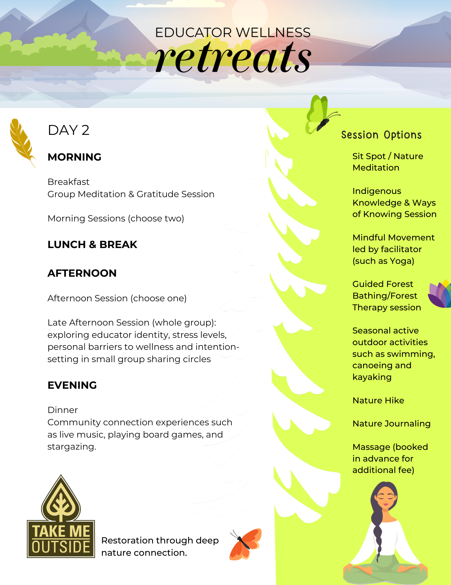 Cancellation Policy: Please notify us as soon as possible at info@takemeoutside.ca if you need to cancel your registration. Cancellations made at least 30 days before the date of the Retreat are fully refundable. In the case that Take Me Outside had to cancel an Educator Wellness Retreat, every effort would be made to notify participants one month before the Retreat and all registration fees would be fully refunded.