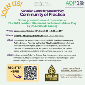 Learn about the recently-launched global 2025 Position Statement on Active Outdoor Play, led by Outdoor Play Canada! Discover what was involved in launching this global-consensus project, listen-in on an overview of the evidence that informed it, and learn about the calls to action and recommendations, and how these may apply to your work.