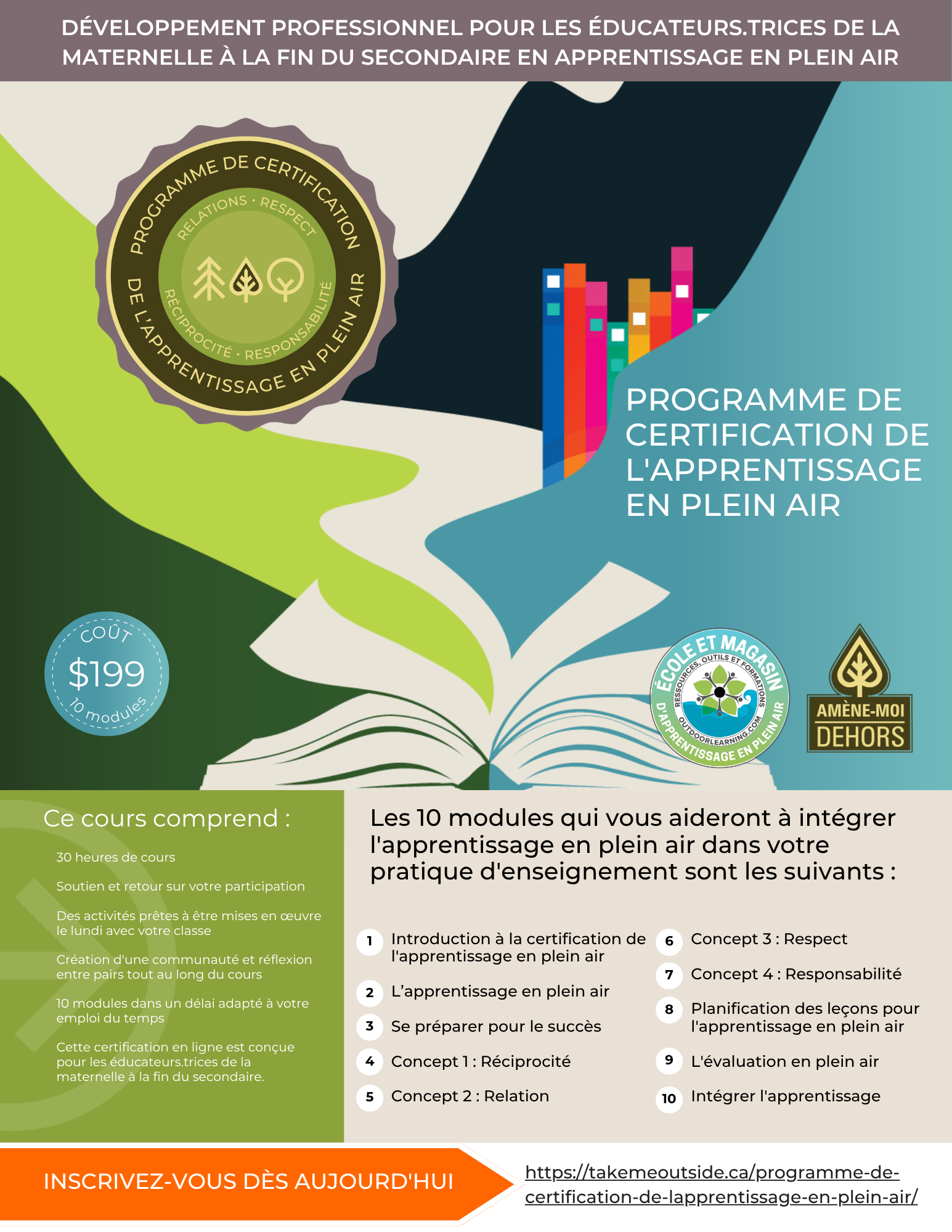 Cette certification vous donnera la confiance nécessaire pour emmener votre apprentissage à l’extérieur, quel que soit le sujet ou le temps. De l’installation, des autorisations et de la planification à la programmation et à l’évaluation, ce cours vous donnera les outils pour intégrer l’apprentissage en plein air dans votre pratique d’enseignement.