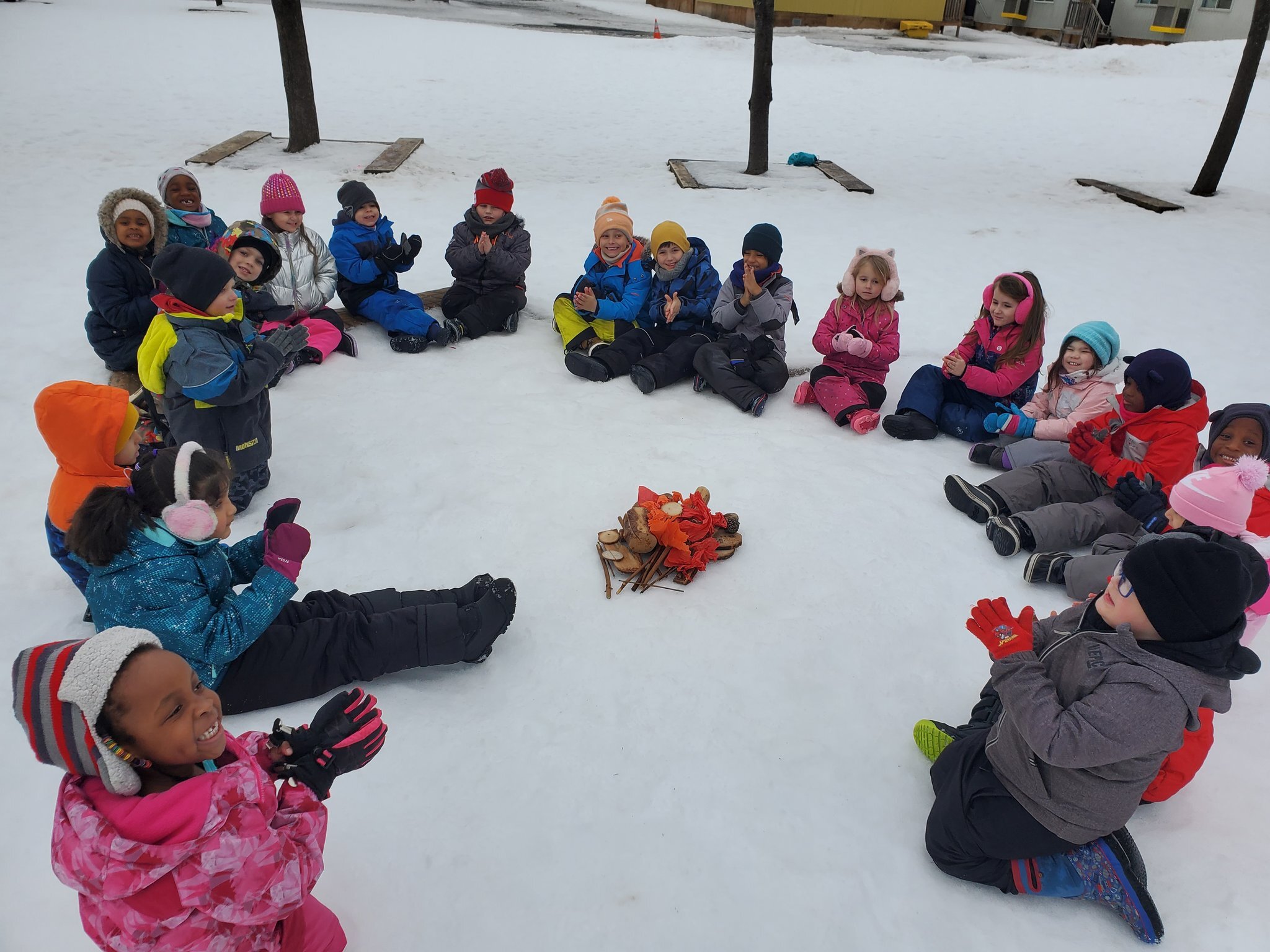 défi hivernal” is campfires and picnics! Students enjoyed working together to build campfires on this damp and cloudy day. They pretended to warm their hands and roast marshmallows!”